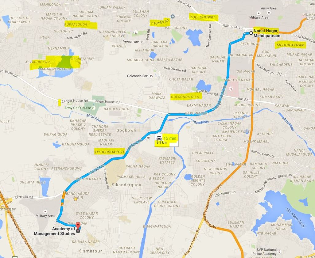 Mehdipatnam -Nanal Nagar Cross Roads- Langar House - Tipu Khan Bridge (Moinabad Road) - Kali Mandhir (Before Shadan Engineering and Medical College) - LEFT TURN (Church) - Go 500 meters - Academy of Management Studies.